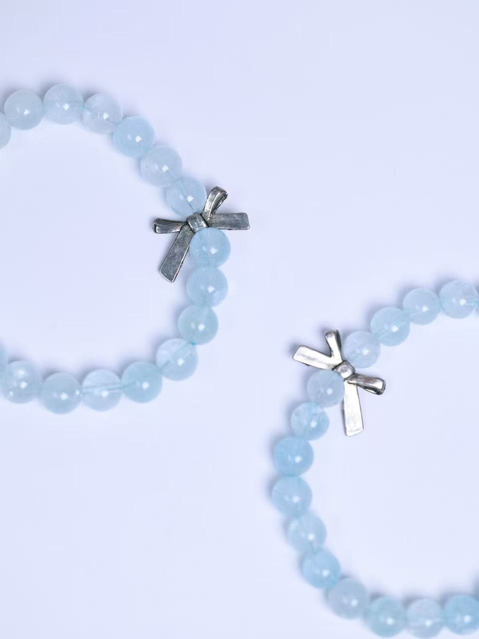 This aquamarine bracelet is strung with beads of sea-clear pale blue gemstones, their hues shifting naturally from crystalline shallow-blue to the tranquil blue of deep waters. Each bead glows with a glass-like clarity, and under light, inner reflections seem to ripple like sunlight passing through ocean waves—bringing a cool, serene marine energy to the wrist.