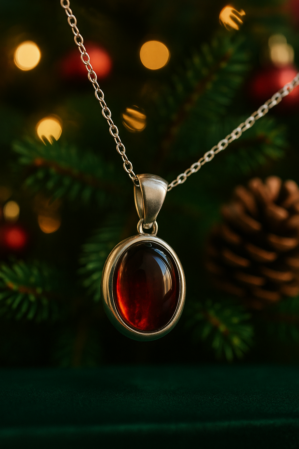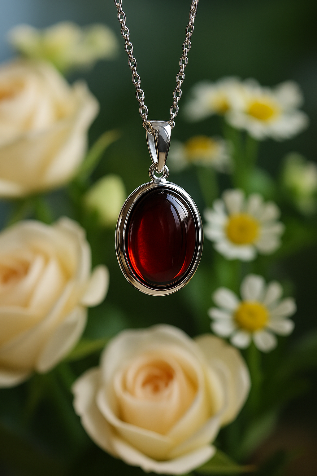 A captivating pendant handcrafted from natural blood amber, renowned for its deep, wine-red translucence and warm glow under light. The large oval cabochon is gracefully set in polished S925 sterling silver, creating a timeless contrast between fiery amber and cool silver.
